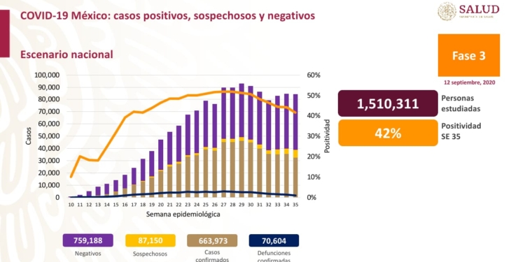 Ciudad de México. Índice Político.- Este sábado 12 de septiembre en la conferencia diaria sobre Covid-19 que se hace en Palacio Nacional se informó que en México se reportan 421 decesos a causa de este coronavirus, con lo que el número de víctimas fatales ascendió a 70,604 en el país.