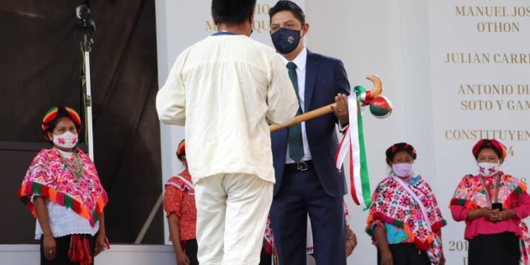 En la toma de protesta integrantes de las etnias Tenek, Náhuatl y Xiu’i realizaron un ritual de purificación para entregarle también un bastón de mando, como muestra de respaldo a su nueva encomienda.