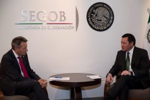 CIUDAD DE MÉXICO, 19 de octubre (AlmomentoMX).-El Secretario de Gobernación, Miguel Ángel Osorio Chong, se reunió hoy con el presidente del Comité Internacional de la Cruz Roja, Peter Maurer, con quien dialogó sobre temas diversos como son el apoyo recibido de esa institución con motivo de los terremotos ocurridos el 7 y 19 de septiembre pasados en nuestro país.