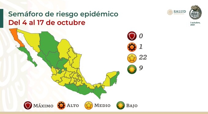 ⇒ De acuerdo con el nuevo semáforo —que estará vigente del 4 al 17 de octubre—, el país se pintó de amarillo [riesgo medio] al colocar a 22 estados en ese color; mientras que nueve entidades están en verde [bajo riesgo de contagio].