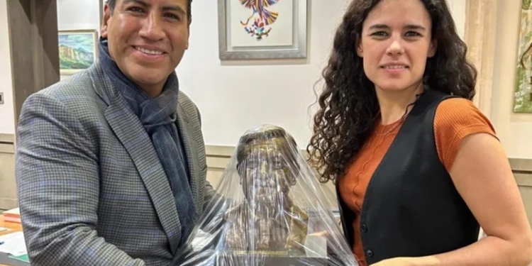 En una de las imágenes se puede ver al senador y la funcionaria federal cargando un busto de AMLO emplayado, mismo que habría sido regalado por Ramírez Aguilar a Alcalde Luján, en la oficina de la extitular de la Secretaría del Trabajo y Previsión Social (STPS), en el llamado Palacio de Cobián.