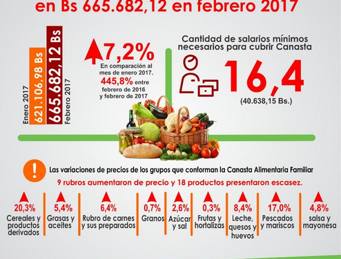 Según el informe del Centro de Documentación y Análisis de la Federación Venezolana de Maestros (Cendas – FVM), publicado por El Nacional, reseña que una familia de cinco miembros necesita 20.703.56 bolívares diarios, 15.3 salarios mínimos, para cubrir el costo de la canasta.