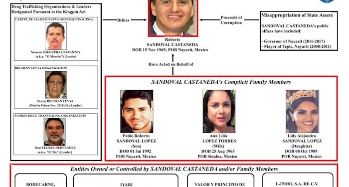 “Funcionarios como Isidro Avelar Gutiérrez y Roberto Sandoval Castañeda se enriquecen cruelmente a expensas de sus conciudadanos. Ya sea que estén recibiendo sobornos de organizaciones de narcotráfico o participando en una variedad de otras actividades ilícitas”, señaló Sigal Mandelker, subsecretario de terrorismo e inteligencia financiera estadunidense.