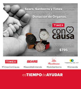 CIUDAD DE MÉXICO, 25 de octubre de 2016 (AlMomentoMx) .- La empresa Timex, en conjunto con Sanborns y Sears preparan la camapaña Reloj con Causa para apoyar a la Fundación Trasplante y Vida IAP.