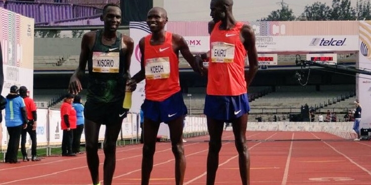 Sus compatriotas Edwin Kipngetich Koech, con 2:12.38 horas, y Matthew Kipkoech Kisorio, con 2:13.25, ambos también tiempos extraoficiales, completaron el grupo keniano que subió al podio en el estadio olímpico de Ciudad Universitaria.