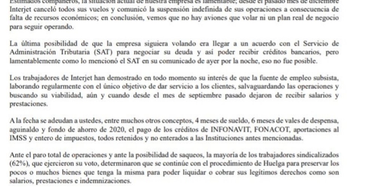 A las trabajadoras y trabajadores que prestan sus servicios en ABC Aerolíneas, S.A. de C.V. (Interjet) y a la opinión pública. pic.twitter.com/tzIo3qIacp— SATMX (@SATMX) January 7, 2021