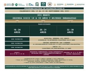 TAMAULIPAS.- Hoy 15 de septiembre será el último día que estarán vacunando en el municipio de Río Bravo a personas mayores de 18 años en el hospital general “Río Bravo”, unidad deportiva “Las Liebres” y el CBTis 73.