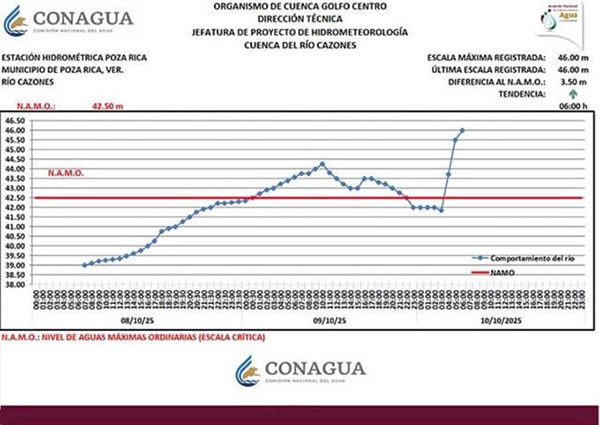 No es un rumor, ni una suposición malintencionada. La gráfica oficial de la Comisión Nacional del Agua (CONAGUA) es clara y demoledora: entre las tres y las cinco de la madrugada del 10 de octubre de 2025, el nivel del río Cazones se elevó 3.5 metros. En solo dos horas. En la ciencia hidrológica no existen los milagros: ese aumento súbito no es consecuencia de la lluvia —que fue constante pero no torrencial— sino del posible desfogue de las compuertas de la presa de Necaxa, cuyo impacto aguas abajo se tradujo en el riesgo inmediato para miles de familias en Poza Rica y otros municipios veracruzanos.