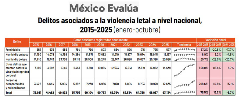 Mientras tanto, el contexto nacional también muestra señales de recuperación. Feminicidio, homicidio doloso y delitos vinculados a la violencia letal registran descensos que van del -4.9% al -17.7%, un comportamiento que refuerza la idea —incómoda para algunos sectores— de que México no está hundido en una crisis generalizada, como ciertos actores políticos insisten en repetir para construir capital electoral.