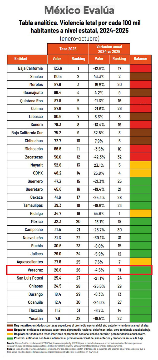 Los números son claros. Con una tasa de 26.8 víctimas de violencia letal por cada 100 mil habitantes, Veracruz ocupa el lugar 26 de 32 entidades federativas. En un país donde las comparaciones suelen ser injustas —porque se contrastan realidades profundamente desiguales—, este indicador coloca a la entidad muy por debajo de los focos rojos nacionales: Baja California, Sinaloa, Morelos o Guanajuato.