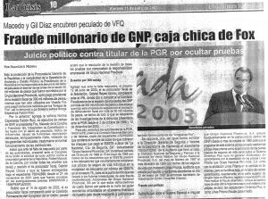 Agregó que ante la falra de respuesta de las autoridades, el pasado 12 de junio de 2003, el ex procurador fiscal, Gabriel Reyes Orona, dio a conocer que a la Comisión Fiscalizadora de la evasión de impuestos por parte de GNP por más de 300 mil millones de pesos y que el pago que hizo esta empresa de seguros por concepto de defraudación fiscal por más de 50 mil millones de pesos, se deriva de todo lo que se desprende de las investigaciones de la denuncia presentada ante laPGR desde el 2 de octubre de 1998 y 13 de diciembre de 2000.