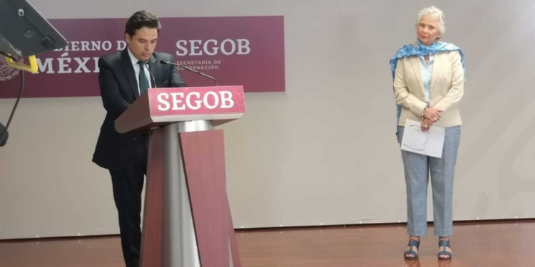Olga Sánchez Cordero, secretaria de Gobernación, y Zoé Robledo, nuevo director del IMSS, hablan en conferencia de prensa ante los medios de comunicación.